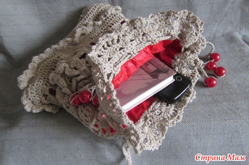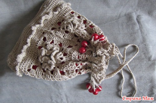 В той, что светлее - красная подкладка и деком шнурков красными бусинами. Пряжа ЛЕНОК. Уф! Наконец то он у меня заканчивается!