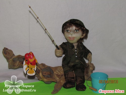 Наконец-то мой рыбак родился, оделся и обулся))))) Уже и рыбину поймал! О как! Удочку любезно спонсировал, вернее изготовил мой любимый друг, соратник и