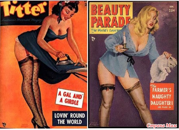 В 50-х годах Pin-Up принял немного другую позицию. На обложках появились рисунки красоток, которые загорали нагишом и прикрывались только веером или полотенцем. А самые отважные художники решались изобразить обнажённую женскую грудь.