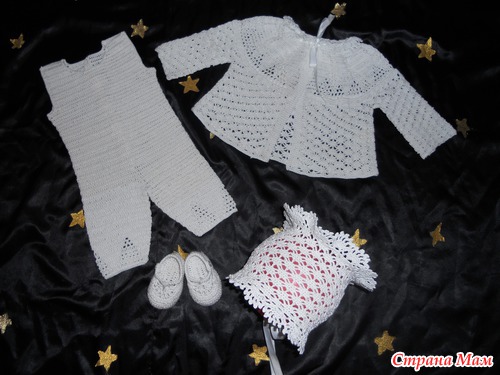 Вот такой комплектик у меня связался. Комбинезончик и кофточку вязала по описанию (смотрите фото) пинетки и шапочка из описания мне не понравились и я связала их по своему. Ниточки Роза (Вита коттон). Вот что получилось