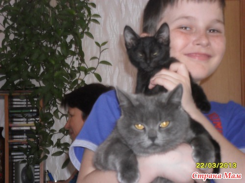 А еще у них два кота:взрослый-Дым и котенок Лис,6 курей, петух и два кролика. За животными ухаживают братья.