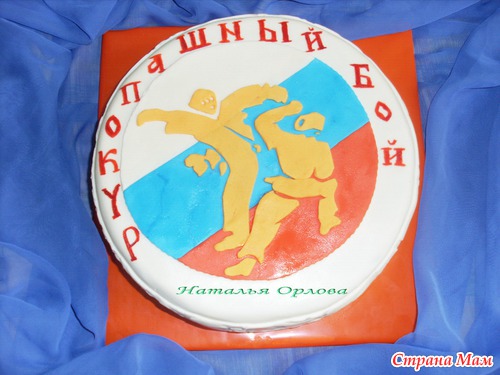 Здравствуйте мои дорогие, сразу извинюсь за качество фоток, фотоаппарат походу приказал жить, делала торт мальчику любителю рукопашного боя, хотела сделать черный лес, коржи спекла шоколад, растопила, поставила сливки сбивать и отвлеклась, поворачиваюсь, а там уже масло прыгает, пришлось, слегка растопить добавила яйцо и муки получился вкуснючий заварной крем, пока делала эмблему, открыла окно и она заветрилась,