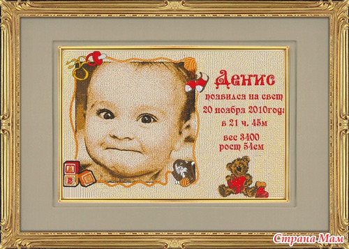 Можно сделать и фотовышивку детской метрики. На этой метрике будет присутствовать не только имя и данные рождения малыша но и вышитая фотография ребенка. Вариантов оформления такой фото-метрики - множество, так же как и ее оформления. Ведь украсить такую метрику можно и бисером и ленточкой и вышивкой разных героев из мультфильмов. Но несомненно вышитая метрика -это гордость для каждой мамы