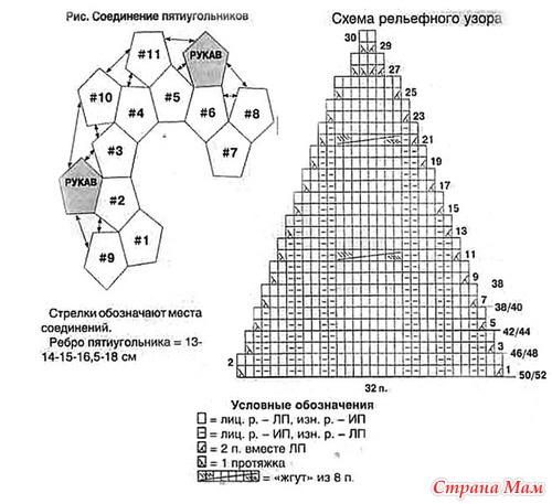 На спицы набрать 27-29-31-33-35 п., поднять 26-28-30-32-34 по стороне пятиугольника 8; 26-28-30-32-34п. по стороне пятиугольника 6; 26-28-30-32-34 п. по стороне пятиугольника 5; 27-29-31-33-35 п. по стороне пятиугольника 11 (см. схему) = 132-142-152-162-172 л. Вязать, как пятиугольник 1 до 20-20-16-16-12-го р. узора = 72-72- 92-92-112 п. Вязать 16 р. прямо, выполняя «жгуты» в каждом 10-м р.