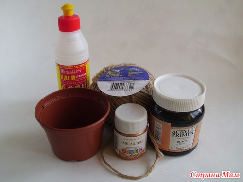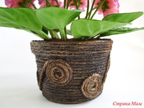 Если кого-то заинтересовало оформление кашпо, то я их делаю вот из этих материалов. Покупаю 5-7 рублёвые горшочки, мажу клеем, обматываю джутовым шпагатом (он чище и ровнее пенькового), делаю аппликацию из того же шпагата, густо замазываю акриловым грунтом, выделяю блестящей краской выпуклые детали и всё. Ничего сложного, а выглядят очень эффектно. Вот здесь я уже использовала подобную технику: https://www.stranamam.ru/post/3751973/.