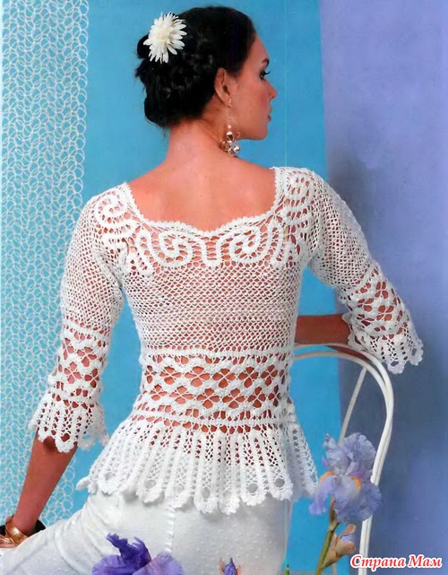 Элегантный блузон подойдет и для офиса, и для похода в гости — он прекрасно сочетается и с костюмами, И с нарядными юбками и классическими 6рюкпми. Модель связана крючком в технике брюггского кружева.