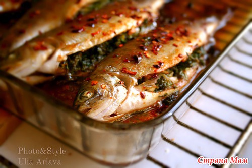Разогреть духовку (180С). В форму выкладываем рыбу, тушку которой предварительно смазываем, с помощью кисточки, маслом. Затем, начиняем каждую подготовленным ароматным "фаршем".
