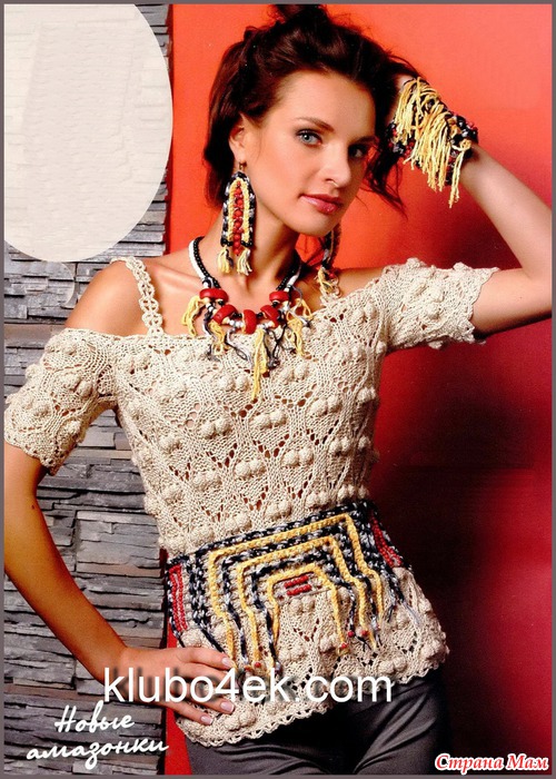 Сборка: выполнить боковые швы, оставляя снизу по 20 см для разрезов. Втачать рукава и выполнить швы рукавов. Крючком № 3 обвязать вырез горловины, нижний край и рукава каймой. Для каждой бретели связать цепочку из возд. п. необходимой длины и обвязать её с обеих сторон 2-м р. каймы.