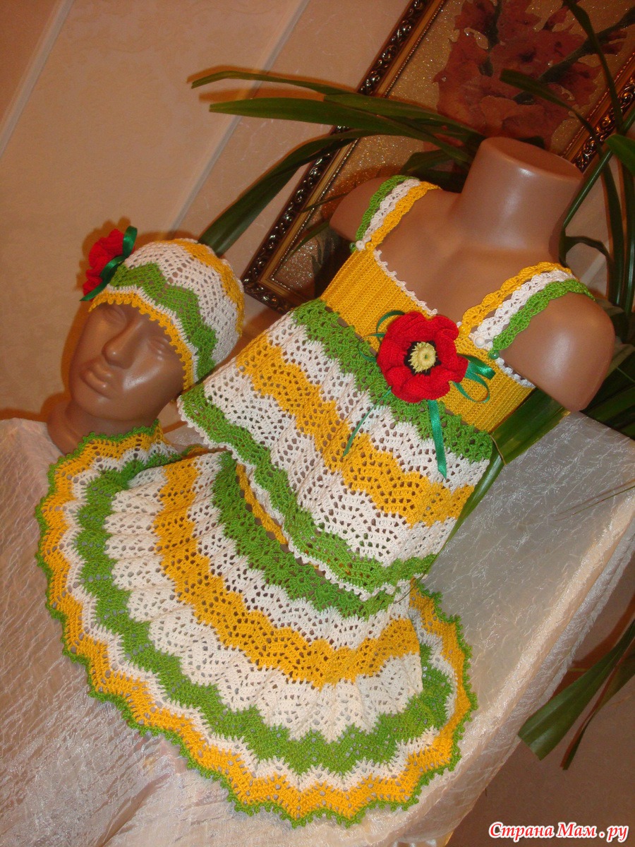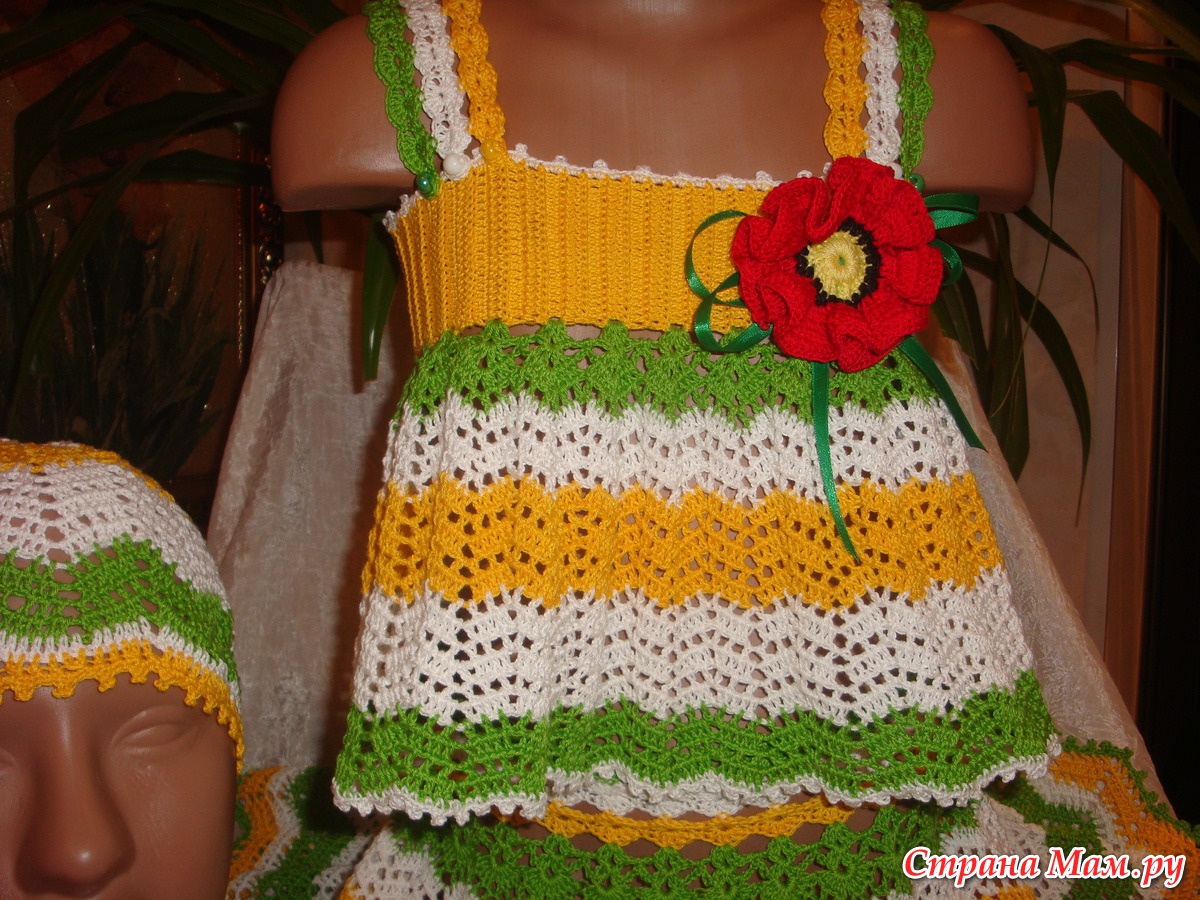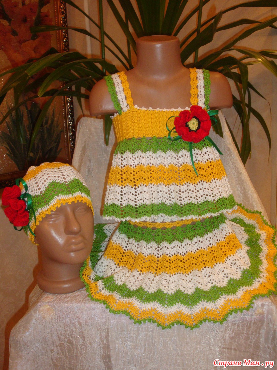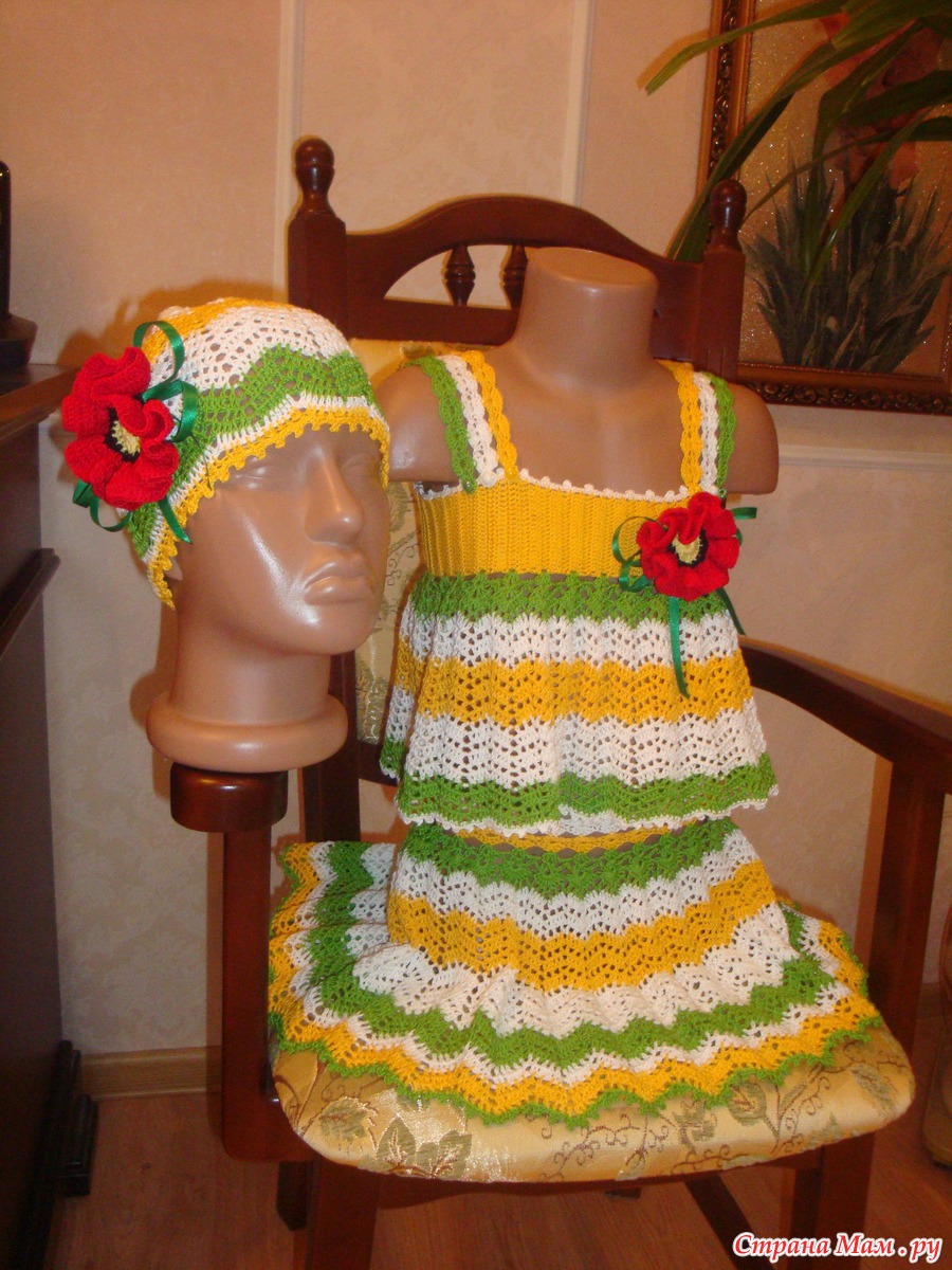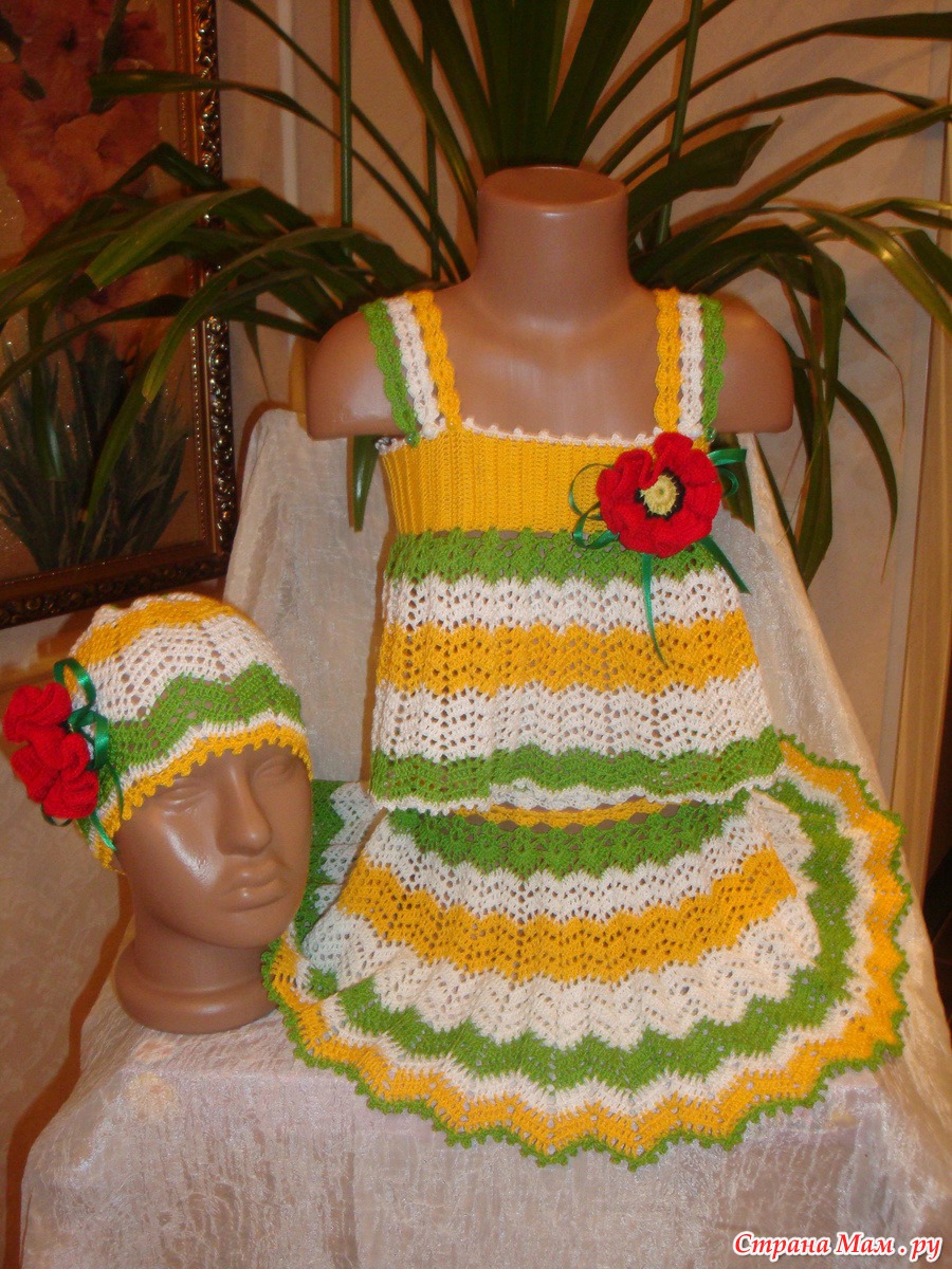 Здравствуйте дорогие рукодельницы и жители страны мам!!! Дождалась я своих помощников(манекены), и представляю свою работу в полном объеме. Связала доченьке летний костюмчик. Зигзаг в разных оттенках. А вдохновила меня юбочка, которую я нашла на просторах интернета. Спасибо автору. Немного изменяла по своему. Дополнила топиком и шапочкой. Всем приятного просмотра и спасибо за коментарии!!!
