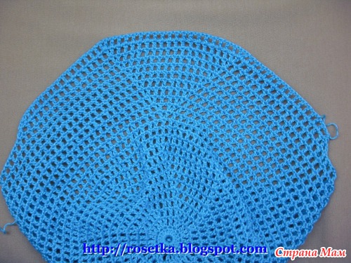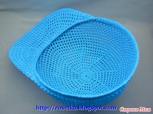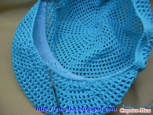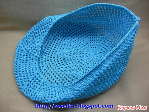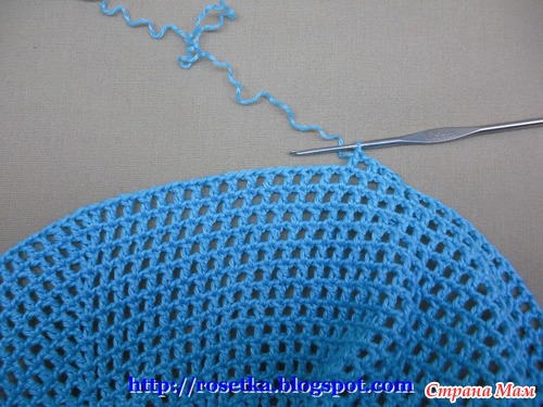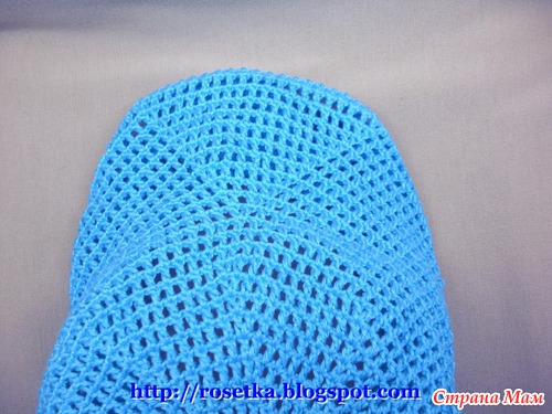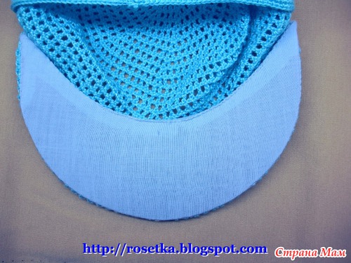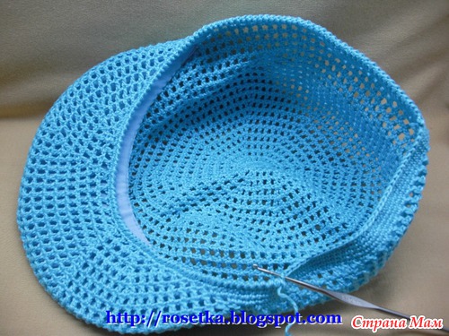 Когда на козырек довязаны эти два дополнительных ряда, нить вновь отрезаем и привязываем её к затылочной линии, чтобы вновь продолжить вязание по кругу.