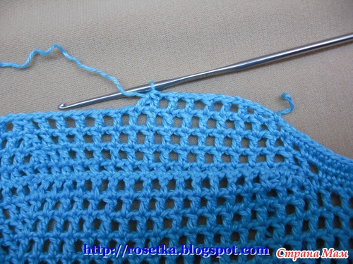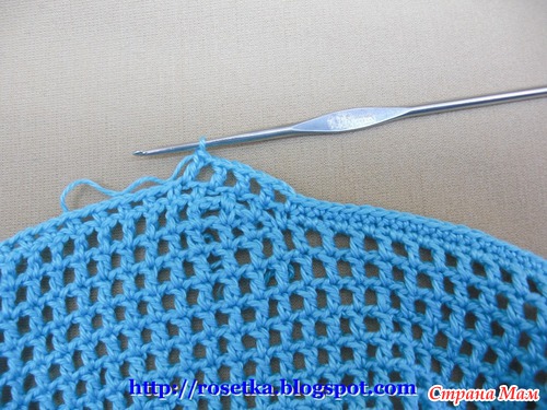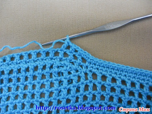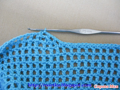Дальше продолжаем вязать клетки филейной сетки без прибавлений из полустолбиков с накидом (Псн) и воздушных петель.