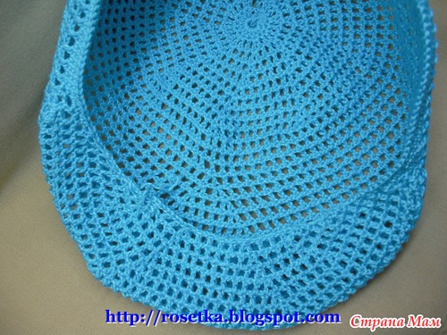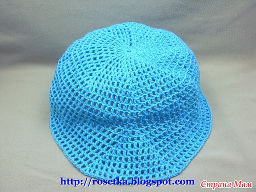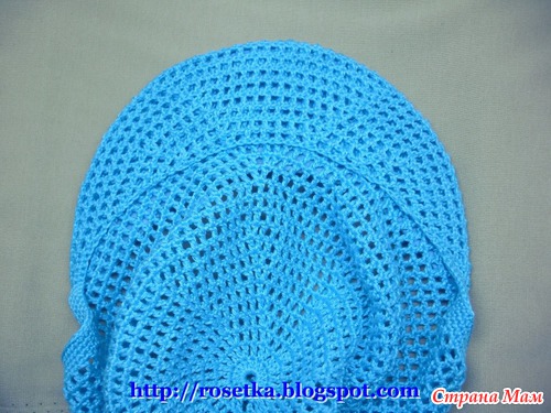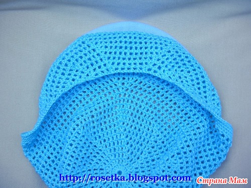 К линии начала ряда на затылке, привязываем нить и обвязываем всю кепку по кругу, вместе с козырьком рядом столбиков без накида.