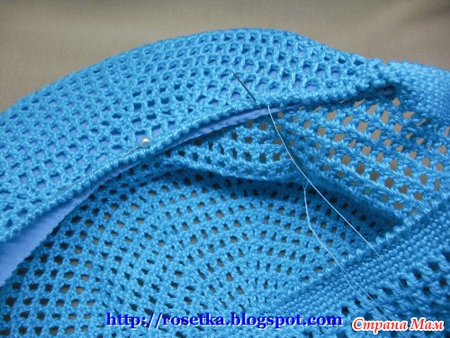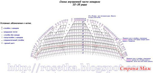 Начинаем пришивать козырек по внешней выпуклой линии сгиба вязаной части козырька – это основание 25-го ряда, ряда с полустолбиками с накидом, отмеченного на схеме красным цветом.