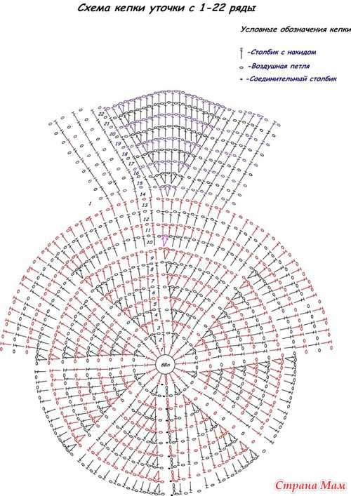 С 14-го по 22-й ряд (9 рядов) вяжем по кругу, выполняя прибавки только в клине козырька, по схеме.
