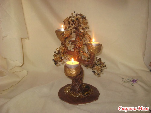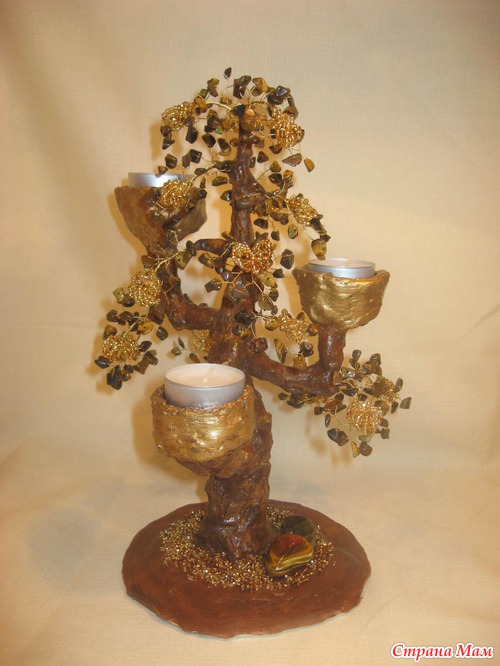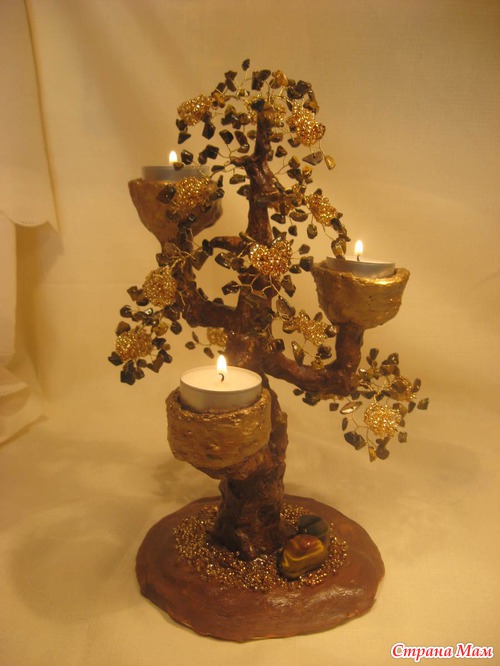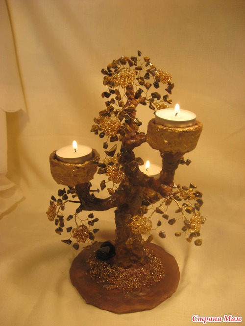 Проба пера, скажем так. Вдохновилась увиденным у мастера Ольги Широбаны - http://stranamasterov.ru/node/471162? с, но делала по своей задумке. Камушки тигровый глаз, золотистый бисер трех оттенков. Если посмотреть сверху - свечи расположены в углах равностороннего треугольника, а ствол - в его центре. Поэтому смотрится посередине стола с любой точки.