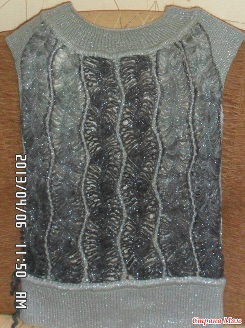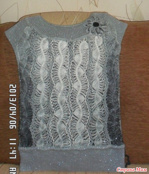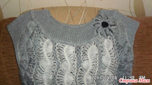 Докупила еще один моток однотонных ниток и связала горлышко, "рукавчики" и широкую резинку внизу. Из остатков сделала брошь для украшения.