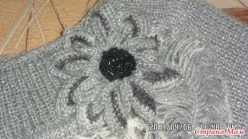 Докупила еще один моток однотонных ниток и связала горлышко, "рукавчики" и широкую резинку внизу. Из остатков сделала брошь для украшения.