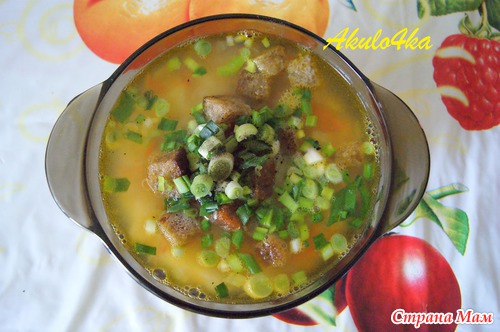 Моем, чистим и нарезаем картофель, морковь, лук. Промываем горох (я его предварительно не замачивала), по желанию можно делать зажарку, но я не делала. Все помещаем в мультиварку, заливаем водой, выставляем режим "каша" и ждем, пока сварится. Готовый суп солим, перчим по вкусу, украшаем зеленью и жареными сухариками.