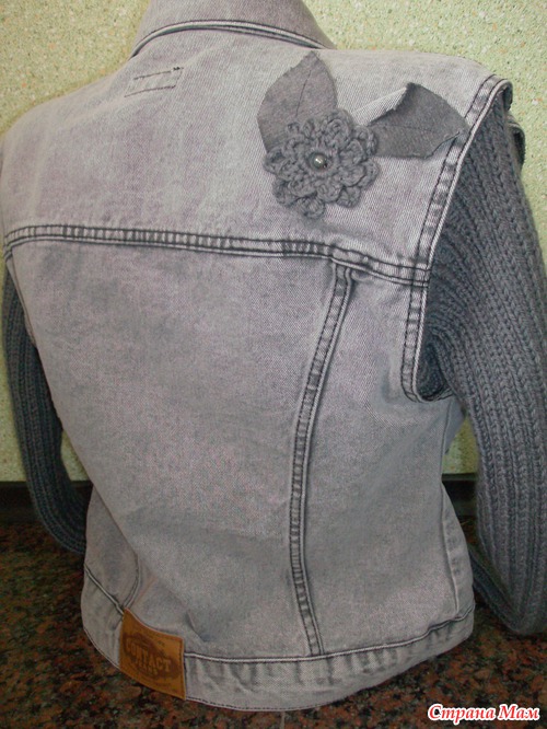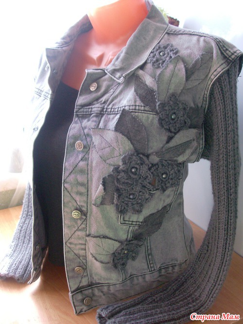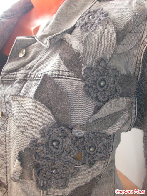 Из джинсовых рукавов нарезала листики (слегка потрепала края) и из пряжи связала цветочки, этим и украсила полочку куртки и немного спинку.