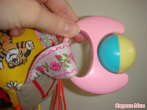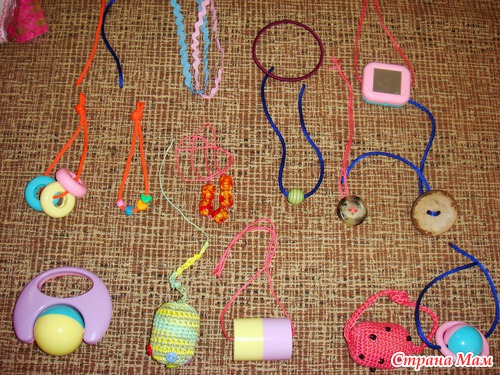 сделала 2 липучки - одна крепить к коляске, кроватке, вторая, чтобы менять игрушки, одевать прорезыватели и удобно мыть
