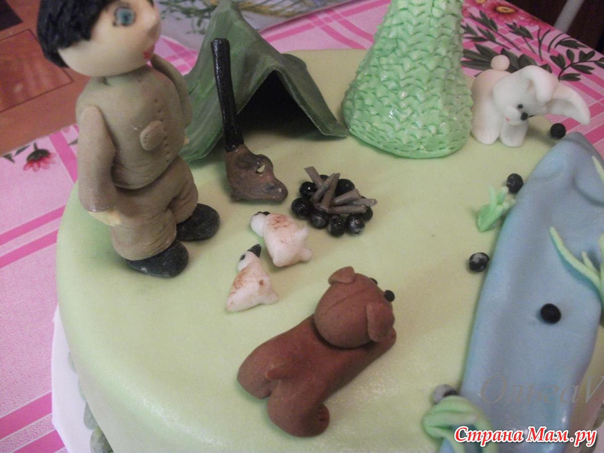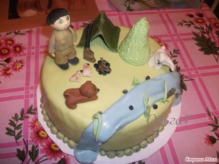 Этот тортик делала для кума он у нас заядлый охотник, да и работа у него с охотой связана. Внутри торт "Панчо" с ананасом и орехами, обтягивала мармышковой мастикой, лепка из "офигенной"