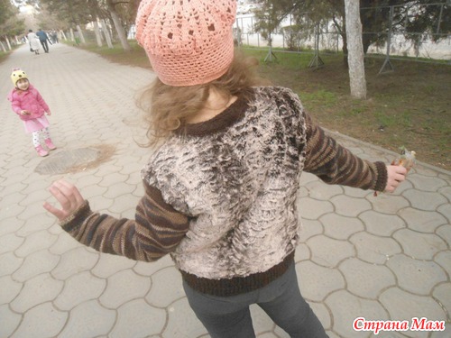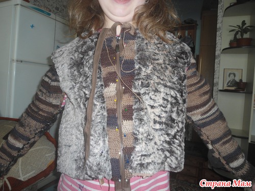 Я четыре года назад своей дочке покупала светлый мех, чтобы сшить жилетку и связать рукава, резинку снизу, ну вообщем так же, как у вас получилось. Дочке не говорила, думала сюрприз сделаю. Связала два рукава, а потом она узрела, чем я занимаюсь, я рассказала и тут мне: "Я такое носить не буду!" Я психанула и закинула все в шкаф. Только полгода назад дочка искала ткань для чего-то в шкафу, наткнулась на мех, я ей припомнила всю историю