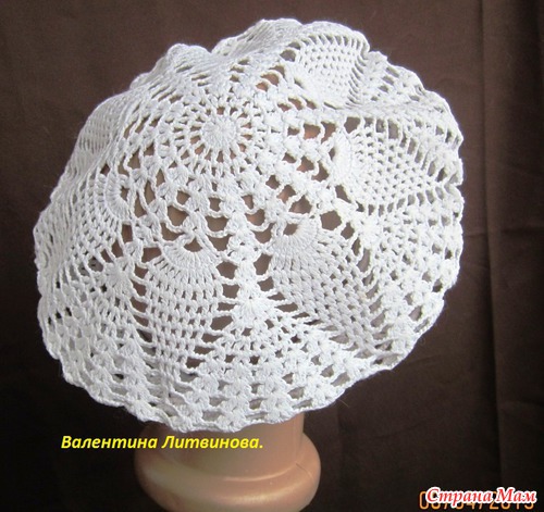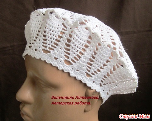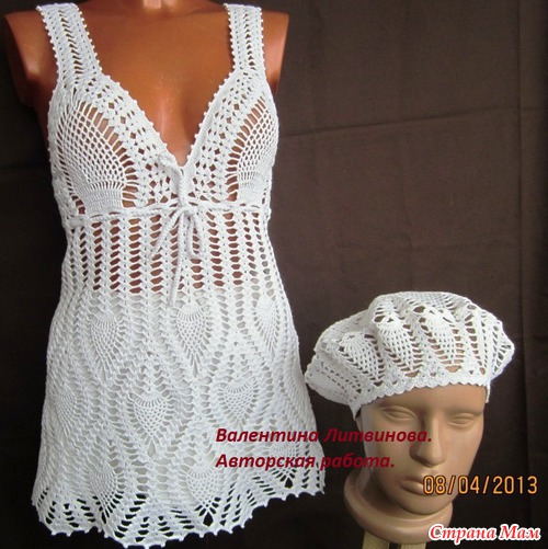 комплект: туника и берет, связаны тонким крючком №1,1. Хлопок. Туника связана рисунком "Ананас" который переходит в рисунок "Сеточка - Рогатка". (2 столбика с одним накидом, 2 воздушных петли, 2 столбика с одним накидом). Рисунки хорошо видны на фото.