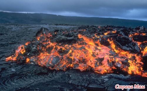Магма, вырвавшаяся из вулкана, называется лавой. Она вытекает из жерла вулкана в виде потока. В начале лавовый поток имеет температуру 1000 градусов и течет по склонам вулкана со скоростью до 50 километров в час. Но на воздухе лава остывает и затвердевает, образуя вокруг отверстия в земной коре вулканическую гору. Кусочки застывшей лавы — пемза. Внутри этого камешка пузырьки воздуха. Это потому, что лава кипела и бурлила, а потом так и застыла.
