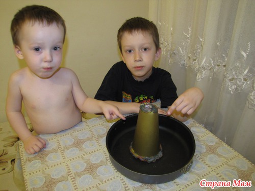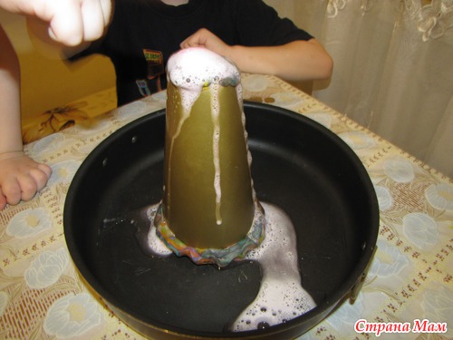 Здесь все стандартно: конус из картона и пластилина, внутри бутылка со смесью воды, соды и красной гуаши (у нас она плохо перемешалась и лава почти не окрасилась). Доливаем в "кратер" уксуса - и вот оно извержение