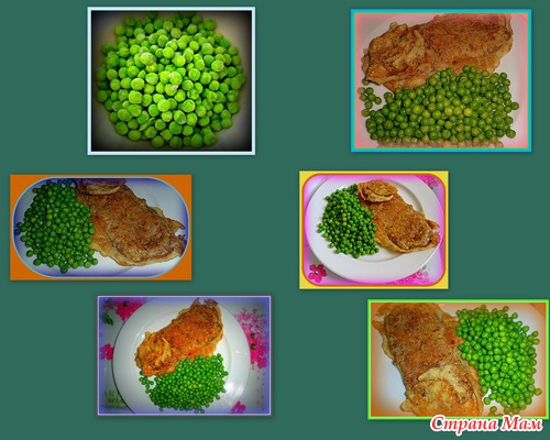 Горошек покупаю свежезамороженный... Заливаю его кипятком- немного полежит и сливаю эту воду... потом горошек в дуршлаг и ещё проливаю кипятком из чайника... Всё - гарнир готов! как дополнение к гарниру можно использовать солёный огурчик или свежий помидорчик!