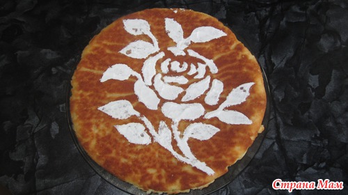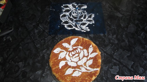 )Кладем сверху наш трафарет, засыпаем сахарной пудрой, затем аккуратно поднимаем трафарет и убираем его в сторонку