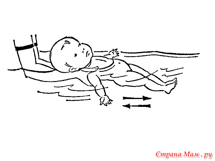 При обучении плаванию, применяется также способ поддержки "двойным замком"в положении ребёнка на спине: наклонитесь над ванной, подведите обе ладони под спину малыша и большими пальцами рук как замком, обхватите сверху плечи ребёнка.В таком положении делайте боковые покачивания ребёнка вправо-влево и обратно.После упражнения отдых 1минуту в вертикальном положении (пользуйтесь вертикальной поддержкой).