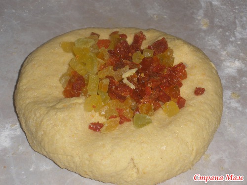 4. Добавить изюм (изюма у меня не было я добавила порезанную сушеную дыню и кизил) и замесить мягкое и не липкое тесто. (Количество муки наверно придется корректировать, т. к. мне пришлось добавлять понемногу, чтобы получить тесто нужной консистенции).