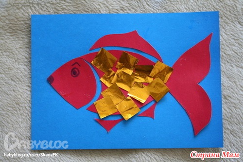 Очень простая и красивая аппликация. На листе картона можно просто нарисовать рыбку или же приклеить ее из бумаги/картона (как в данном случае). Одностороннюю фольгу нарезать небольшими квадратами. Затем на каждый квадратик наносим клей и создаем чешую. Вот и все! Золотая рыбка готова!