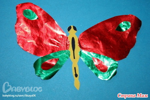 Здесь еще используем бархатную бумагу в дополнении к фольге. Материалы: картон, фольга односторонняя, бумага бархатная, ножницы, клей, фломастеры (подрисовать глазки, усики, что-то еще). Заготовки бабочки малыш клеит на лист картона. Просто и симпатично!
