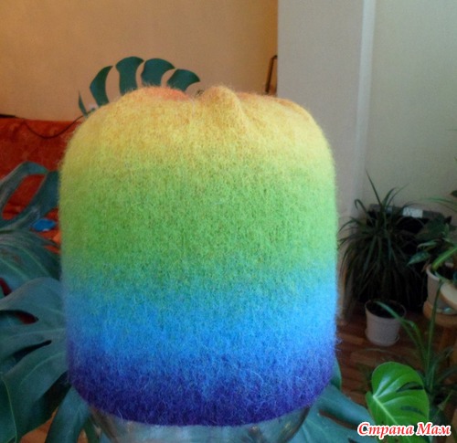 А история комплекта такова. Очень давно заглядывалась на пряжу Кауни, но видела ее только интернете, а тут появилась возможность купить у нас в городе! Я, конечно же решила купить Радугу, думала, что выйдет славная шапочка и шарф для дочери. Купила, счастью моему не было предела! Решила. что шапку непременно попробую свалять. За вечер связала шапку, правда все время одолевали сомнения, уж очень широкая шапка получалась, подумывала даже превратить то, что получалось в свитерок для крестницы ( славный свитерок получился бы надо сказать), но решила идти до конца. в конце концов, если бы не получилось задуманное с первого раза, попробовала бы еще, благо ниток хватало. В общем, утром приступила к валянию. Сначала постирала ее вручную (оооочень грязная пряжа), затем с джинсами в машинке на 60 градусах. Шапка немного подвалялась, получилась ТАКАЯ КЛАССНАЯ!!! Но все еще была велика даже мне, не говоря уже о ребенке (ребенку 10 лет). Но, примеряв шапку на себя, решила, что оставлю ее себе. Вручную доваляла ее до нужного размера, высушила на 3литровой банке.