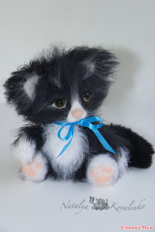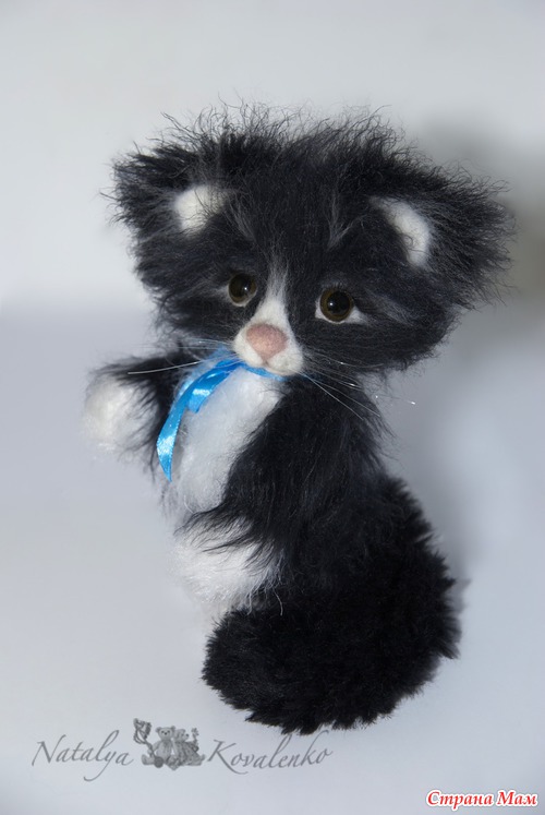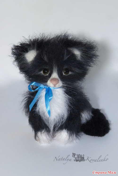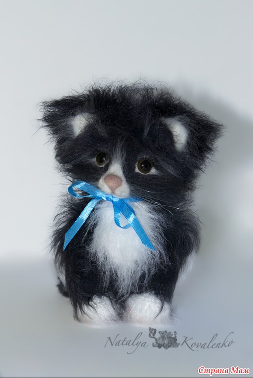Ну вот, сегодня ещё один малыш появился, чёрненький, как ночка. Помните песню: "Жил да был чёрный кот за углом..." Вот хотела сначала сделать его полностью черняшкой, но он никак не хотел становиться абсолютно чёрным, жутко возмущался!!! Пришлось разбавлять белым цветом. Так что вот такой он с непростым характером котёночек Блэкки. Как и всегда связан крючком. Мордочка сухое валяние. Ростик 17 см.