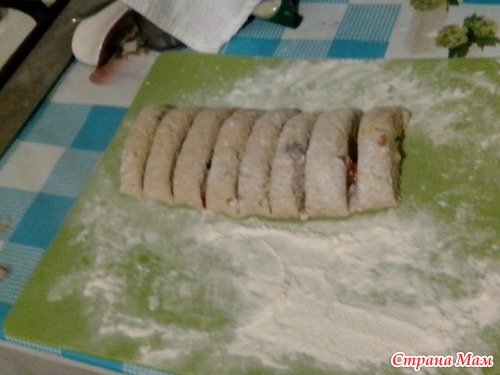 Первую часть раскатала колбаской и нарезала - так удобнее делить. Из этой части будем печь лепешки.