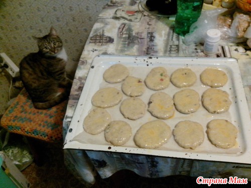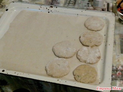 противень застелить бумагой и смазать маслом. Формируем лепешки и укладываем не очень близко друг к другу.
