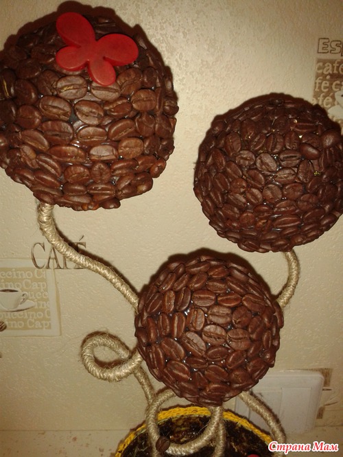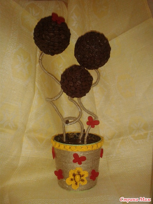 Решила сделать кофейный топиарий, ибо кухня у меня - кофейная. Я никогда этим не занималась, перелопатила кучу мастер-классов и, наконец, за 3 дня сотворила вот что: