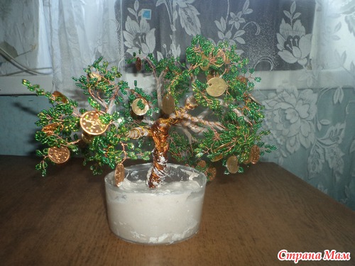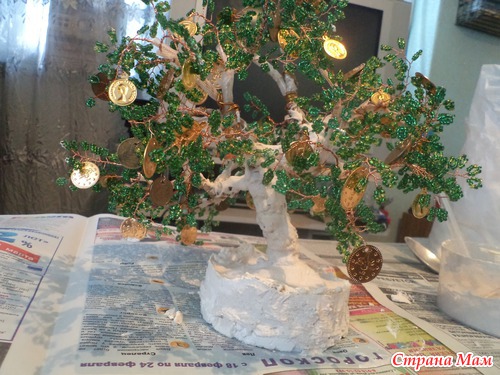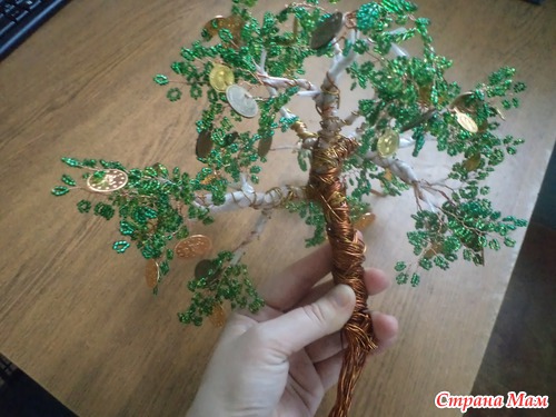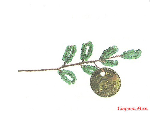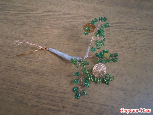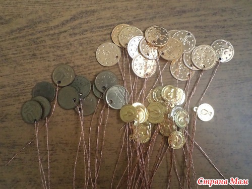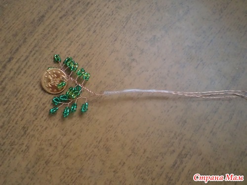 Вплетаем заготовки с монетами в серединки маленьких веточек.