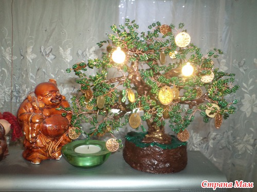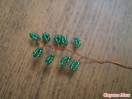 Денежное дерево с монетками выполняем в петельной технике. Нанизываем на проволоку зелёный бисер и плетём меленькие веточки из петелек. Количество бисера в петельке может варьироваться от 7 до 11 штук. От количества бисеринок зависит размер каждого листочка.(От себя: я взяла в каждый листочек 8 бисеринок).