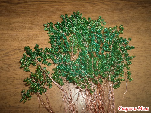 Если есть длинные тяжелые ветки, нужно включить в каркас такой ветки дополнительную проволоку большего диаметра (0,5-1,5 мм). Если этого не сделать, ветка не будет держать форму, рано или поздно работа потеряет свой эстетичный вид.