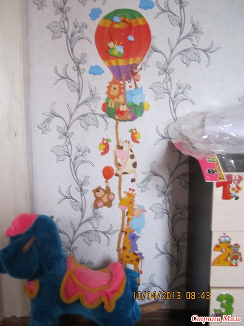 а это у нас уже был такой ростомер, очень классная штука, взяла отклеила и перенесла в другое место и на новом месте он тоже клеится хорошо, а на комоде если видно приклеен счет, это 3d пазлы, тоже очень легко переклееиваются на новое место(это у нас тоже было):