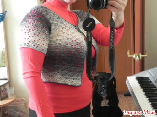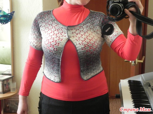 Он еще тянется, на случай если поправлюсь... Посмотрите схемку, это короткий жакет, он такой идет по схемам. Одевала на работу, всем нравится. Главное, что муж в восторге, а на фото все не увидишь