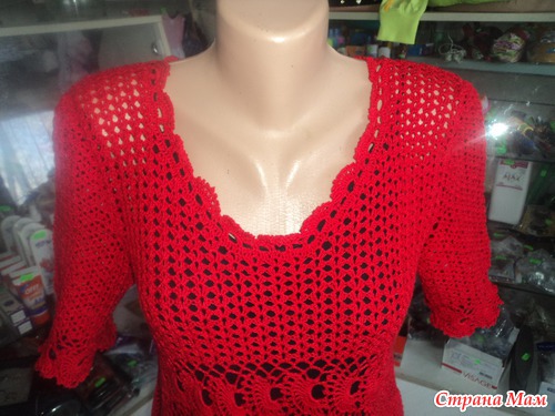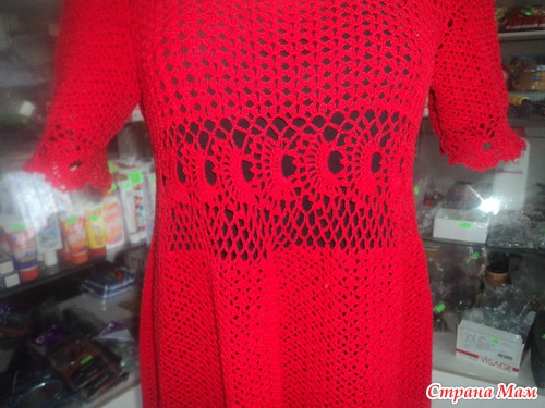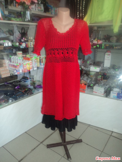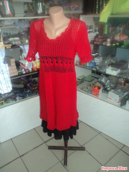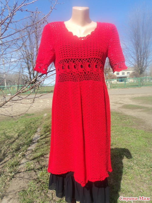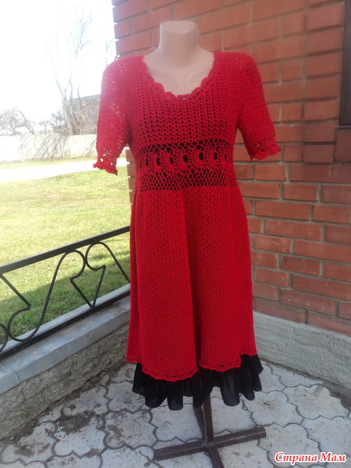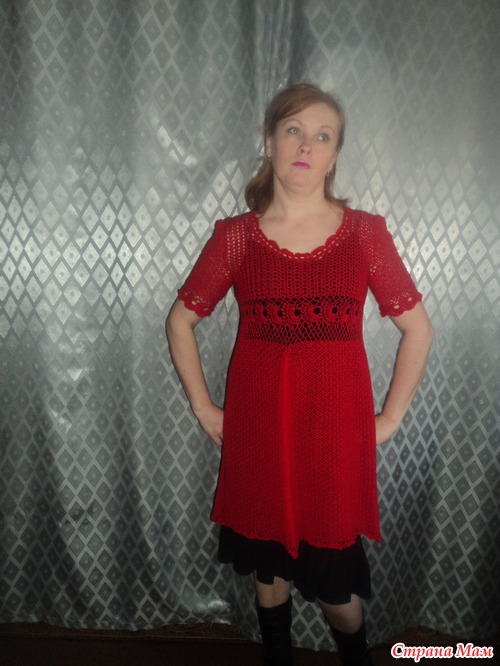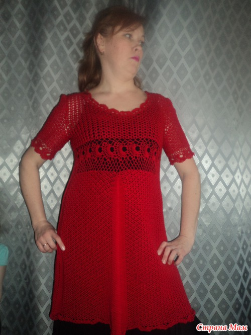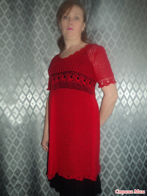 Была у меня мечта - красное платье и я его связала, вот такое по-началу оно у меня было, я с ним и в конкурсе поучаствовала, вот тут оно - https://www.stranamam.ru/post/2299913/ . Но мне что-то оно не сильно было по душе и я решила его перевязать, почти полностью, юбку и рукава, вот что у меня получилось. Вязала из "Маки", пошло на него около 500г, крючок№2.