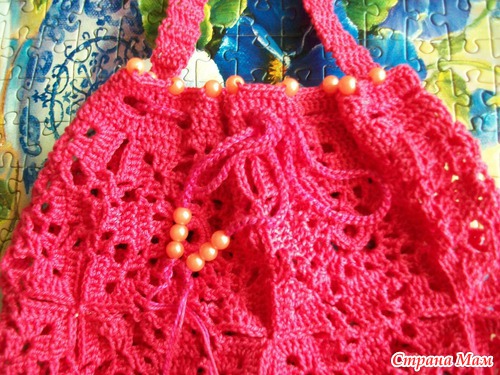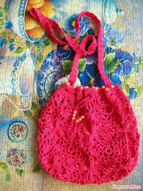 Всего 14 квадратов - 4 квадрата на переднее полотно, 4 квадрата на заднее, по 2 на боковинки, и 2 на донышко. Ручку привязывала от серединки до серединки боковинок.
