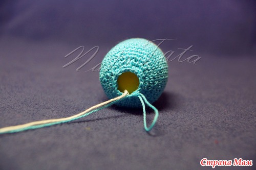 Важно: есть два варианта, либо мы закрываем все петли и тогда наша погремушка будет без ручки, либо делаем убавки до тех пор, пока диаметр отверстия не будет равен диаметру нашего фломастера (у меня это 1 см, т. е. я делаю 4 ряда убавлений).