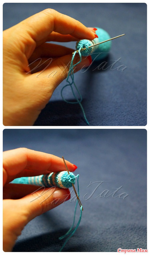 Для того, чтобы аккуратно спрятать конец нитки, введите крючок (или иглу с отрезком нити), подцепите нитку и вытяните ее через боковую часть ручки. Лишний конец нитки отрежьте ножницами.