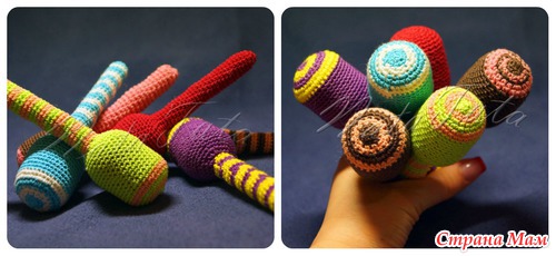 Чтобы погремушка была ярче вяжите двумя цветами, меняя нити в каждом 3-м ряду... Как сделать плавный переход нитей разного цвета смотрите здеь http://uroki-vyazaniya.ru/smena-cveta-niti-pri-vyazanii-kryuchkom.html